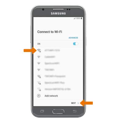 - If you would like to connect to a Wi-Fi network, select the desired network name and follow the on-screen prompts. Select NEXT to proceed without connecting to Wi-Fi.