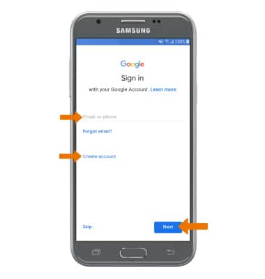 - If you would like to add your Google account, enter your Email or phone then select Next. If you do not have an account but would like to add one, select Create account. If you would like to continue without setting up an account, select Skip.