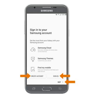 - If you would like to sign into your Samsung account, select SIGN IN then enter your Samsung User ID and password. If you do not already have a Samsung account, select CREATE ACCOUNT and follow the on-screen prompts for setup. If you wish to proceed without setting up a Samsung account, scroll to the bottom of the page and select SKIP.