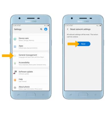 Settings icon > scroll to and select General management > select Reset > Reset network settings > Reset settings > select Reset to confirm.