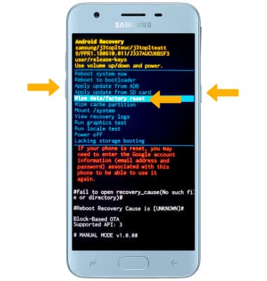 2. Press the Volume down button until Wipe data/factory reset is highlighted, then press the Power/Lock button.
