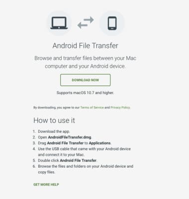 - TRANSFER MEDIA TO/FROM A MAC: You need the Android File Transfer App to facilitate communication between your device and a Mac computer. Download and install the Android File Transfer app.