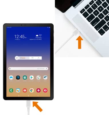 - TRANSFER MEDIA TO/FROM A PC: With the device powered on, insert the USB-C end of the USB-C cable into the port on the bottom of the device. Insert the USB end of the USB-C cable into an open port on the computer.