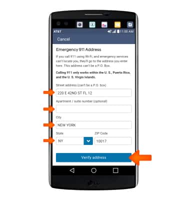 - Read the on-screen prompts, enter your Emergency 911 Address, then tap Verify address.