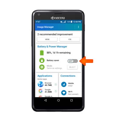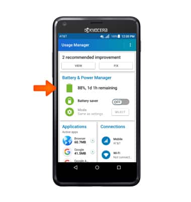- This tutorial shows the device power saving apps and features as well as how to access the devices Usage Manager Battery screen to determine what apps and features are consuming battery power. To access the Usage Manager, from the main home screen, swipe right to left, then tap the AT&T folder.