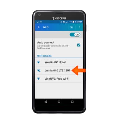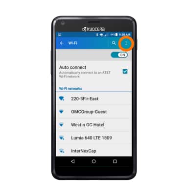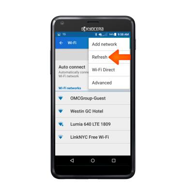 Note: Tap the Menu icon > Add network to connect to a hidden or unbroadcasted Wi-Fi network. You will need to enter the Network SSID, security type, and a password (if necessary) to continue.