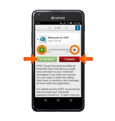 - Tap options to play/pause voicemail, use speaker, return call, or delete voicemail.
