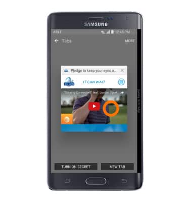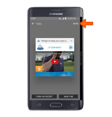 Note: You can also tap TURN ON SECRET to open a Secret mode tab. Secret mode helps you protect your privacy while browsing the internet. When in secret mode the browser background changes to dark grey. Secret mode has a separate bookmark list that can be password protected. When you turn off Secret mode, all history and cookies are deleted. To set a Secret mode password from the browser tap MORE > Settings > Privacy > Secret mode security.
