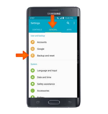 - Swipe to the GENERAL tab, then tap Backup and reset.