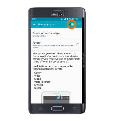 - Private Mode lets you hide specific files within some Samsung apps so that they're no longer in view when you're not in Private Mode. It works in the Gallery, Video, Music, Voice Recorder, My Files and Internet apps. To access, swipe down from the notification bar to access Quick settings.