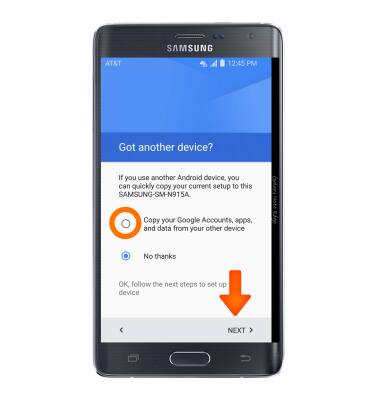 - If you would like to copy any Google Accounts, backup apps and data from your existing Android device tap Copy your Google Accounts, apps, and data from your other device and follow the on screen prompts. Tap NEXT to proceed without Tap & Go.