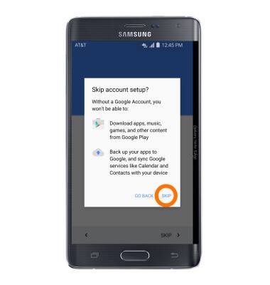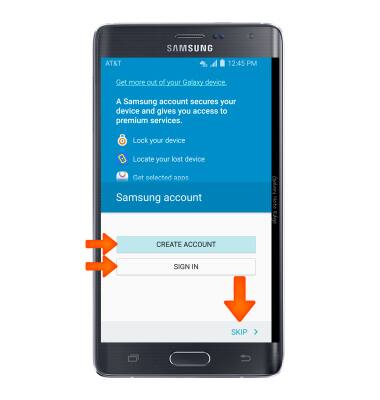 - If you would like to sign into your Samsung account to further secure your device tap SIGN IN or tap CREATE NEW ACCOUNT and follow the on screen prompts for setup. Otherwise, tap SKIP to proceed with setting up an account.