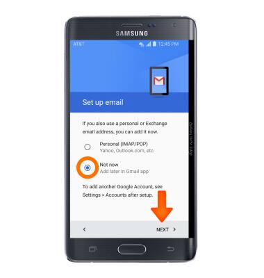 - If you would like to set up your device email tap Personal (IMAP/POP) and follow the onscreen prompts. If you would like to proceed without setting up an email tap Not Now, then tap NEXT.