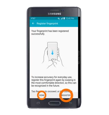 - Tap REGISTER to register this fingerprint again by swiping in the most comfortable direction. Tap DONE to skip this step.