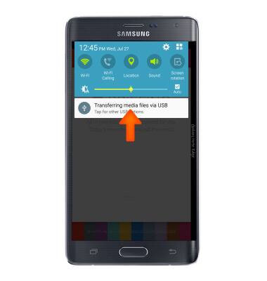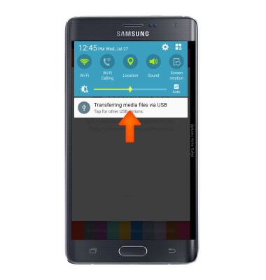 - To place the device into the correct USB mode, swipe down from the top of the screen and tap Transferring media files via USB.