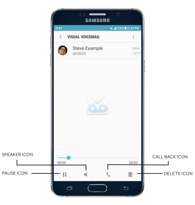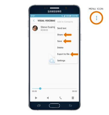 - To delete, send text, share, save, or export a voicemail, select the Menu icon then select the desired option.