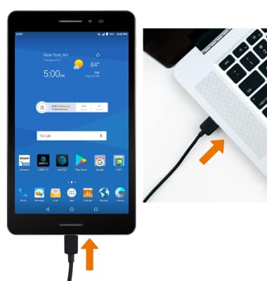 - TRANSFER MEDIA TO/FROM A PC: With the device powered on, insert the USB-C end end of the USB-C cable into the port on the bottom of the device. Insert the USB end of the USB-C cable into an open port on the computer.