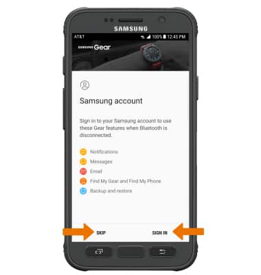 - If you have not done so already, you will be prompted to add your Samsung account. It is not required but if you skip this step, you will miss more functionality such as the ability to set the reactivation lock (in both Bluetooth and Standalone mode), receiving Message/Email notifications through the Samsung server when the device is in standalone mode, and being able to download apps/watch faces. Select SKIP or SIGN IN and follow the on-screen prompts.
