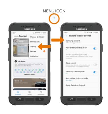 - EDIT SAMSUNG CONNECT SETTINGS: From the Samsung Connect screen, select the Menu icon then select Settings. Edit app features as desired.