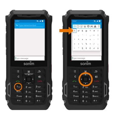 - ENTER SYMBOLS: Press and hold the 1 button to access the Symbols menu, then press the directional buttons to navigate through the symbols pages. Press the Select button to select the desired symbol.