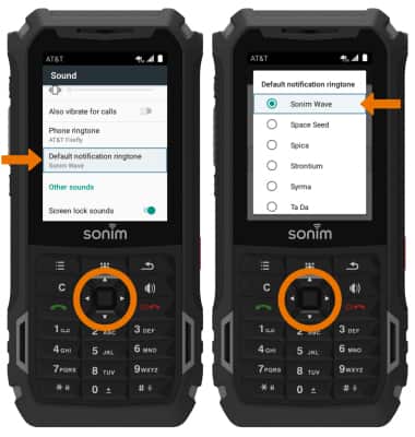 - ADJUST NOTIFICATION SOUNDS: Press the down directional buttons to scroll to Default notification ringtone, then press the Select button. Press the down directional button to scroll to the desired ringtone, then press the Select button.