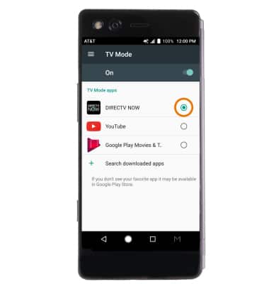 Note: The default app is DIRECTV NOW. If you do not see the desired app, from the TV Mode screen select Search downloaded apps then select the desired app.