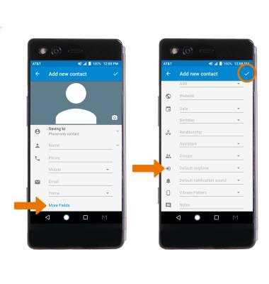 - ADD RINGTONE: Select More Fields. Select Default ringtone > desired Ringtone > OK. When you are finished creating your new contact, select the Checkmark icon.