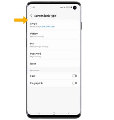 From the Lock screen screen, select Screen lock type > enter your current screen lock > select the new desired screen lock type and follow prompts to complete set up.
