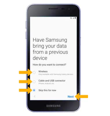 11. If you would like to transfer data from your old device to your new device, scroll to and select the desired connection type circle (Wireless or Cable and USB connector). Select Skip this for now to continue without transferring your data. Select Next to continue. If you are transferring your data, follow the prompts to complete the process.