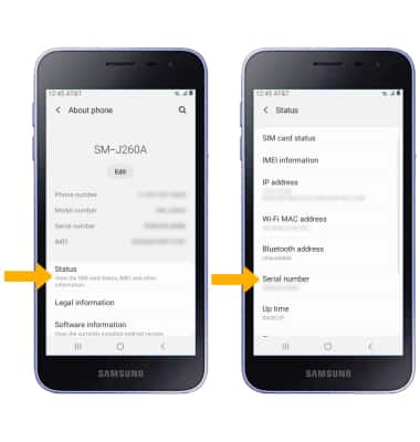 From the About phone screen, select Status. The device's Serial number will be displayed.
