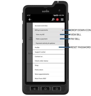 VIEW/PAY BILLS: Select the Drop down icon next to Billing & payment, then select either View my bill or Make a payment.