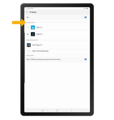 Note: The TV mode switch must be in the on position to view TV mode options. If you do not see the desired app, from the TV Mode screen select Other downloaded apps then select the desired app.