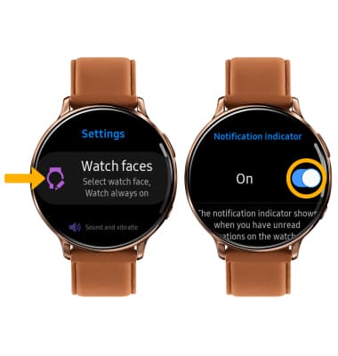 The notification indicator shows when you have unread notifications on the watch face. To turn notification indicator on or off, from the Settings screen select Watch faces > scroll to and select Notification indicator > select the Notification indicator switch.