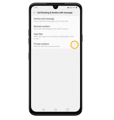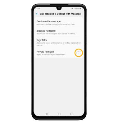 From the Call blocking & Decline with message screen, select the Private numbers switch.