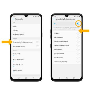 From the Accessibility screen, select Accessibility features shortcut. Select the Accessibility features shortcut switch to enable, then select the desired Accessibility feature shortcut switch.