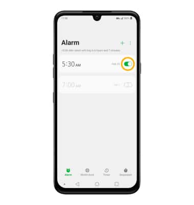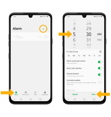 Clock app.2. Select the Alarm tab, then select the Add icon. Set desired alarm time and settings, then select Save when finished.