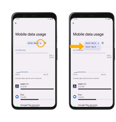CHANGE DISPLAYED BILLING CYCLE: From the App data usage screen, select the Data usage cycle drop-down icon then select the desired billing cycle.