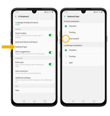 From the LG Keyboard settings screen, select Keyboard type then select One-handed.