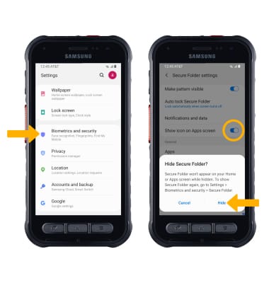 From the Settings screen, scroll to and select Biometrics and security > select Secure Folder > enter your passcode > select the Show icon on Apps screen switch > Hide.
