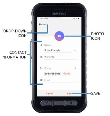 2. Enter the desired contact information in the corresponding fields. Select the drop-down icon to change the desired account you want to save the contact to. To add a picture, select the Photo icon then navigate to the desired image. Select Save when finished.