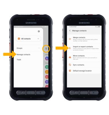 Menu icon > Manage contacts > Import or export contacts > follow the prompts.