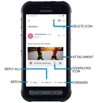 Select Reply, Reply all, or Forward to respond to an email. Select an attachment to view. Select the