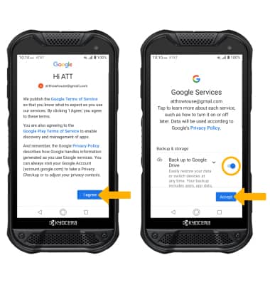 5. Review the Terms of Service and Privacy Policy prompt, then select I agree. Review the Google Services prompt, then select the Back up to Google Drive switch if you wish to do so. Select Accept to complete.