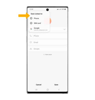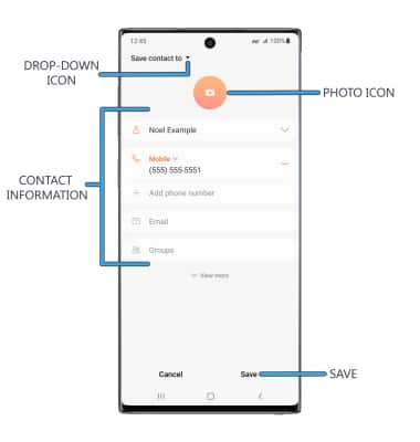 2. Enter the desired contact information in the corresponding fields. Select the drop-down icon to change the desired account you want to save the contact to. To add a picture, select the Photo icon then navigate to the desired image. Select Save when finished.
