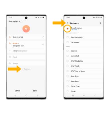 From the edit contact screen, select View more then scroll to and select Ringtone. Select the desired Ringtone, then select the Back arrow.