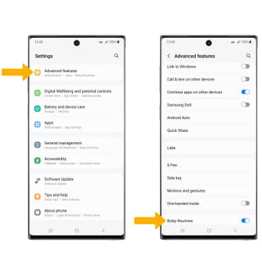 Settings icon. Scroll to and select Advanced features, then select Bixby Routines.