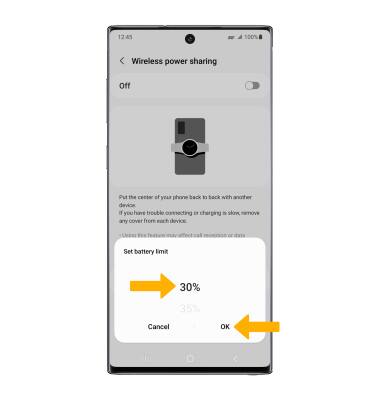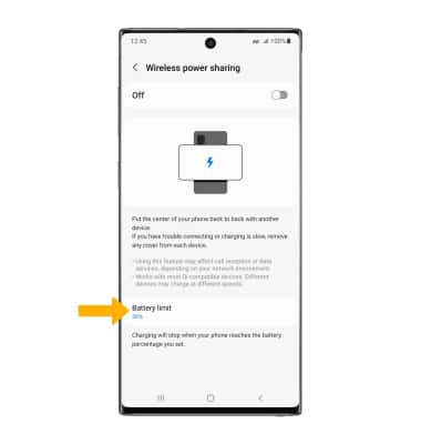 1. Wireless power charging will stop when your phone reaches the battery percentage limit you set. To set a battery limit, from the Wireless Power sharing screen select Battery limit.