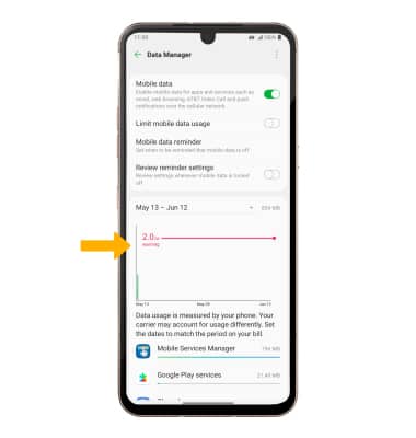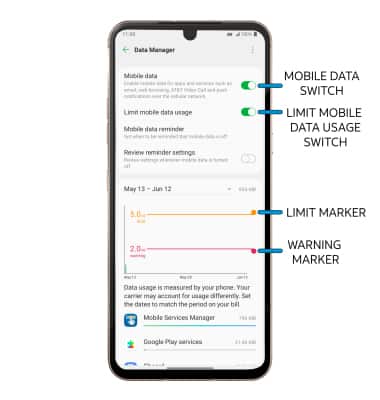 • SET MONTHLY DATA LIMIT: When the Limit mobile data usage switch is enabled, select and drag the Limit marker up or down.