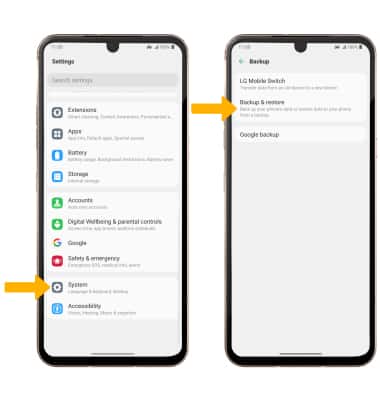 Settings icon. Scroll to and select System > select Backup > select Backup & restore then follow the prompts.