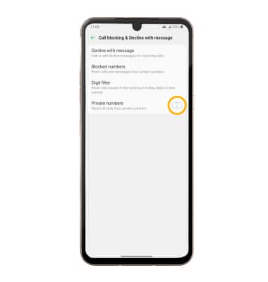 From the Call blocking & Decline with message screen, select the Private numbers switch.